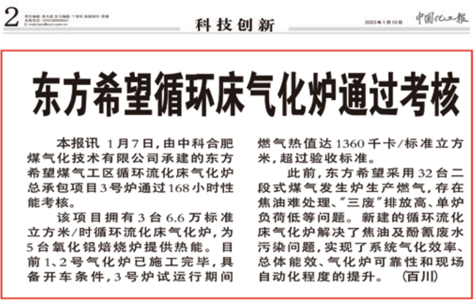 1月7日,由中科合肥煤气化技术有限公司承建的东方希望煤气工区循环流化床气化炉总承包项目3号炉通过168小时性能考核。
