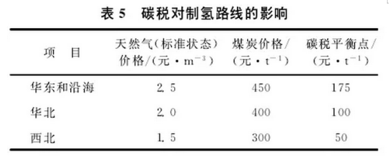 碳税的实施对煤制氢项目的竞争力影响远大于天然气制氢。碳税对制氢路线的影响见表5。